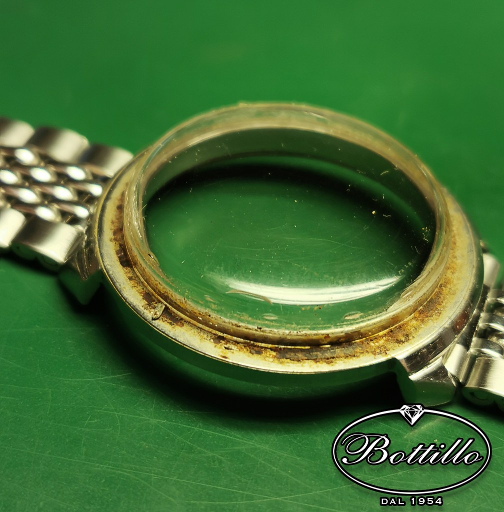Nella sequenza di foto sotto vedete cassa, vetro e ghiera nelle condizioni iniziali, smontaggio totale del calibro 214 e infine il paragone tra vetro nuovo e vecchio.
