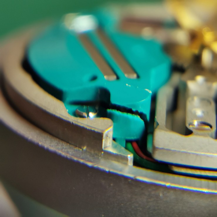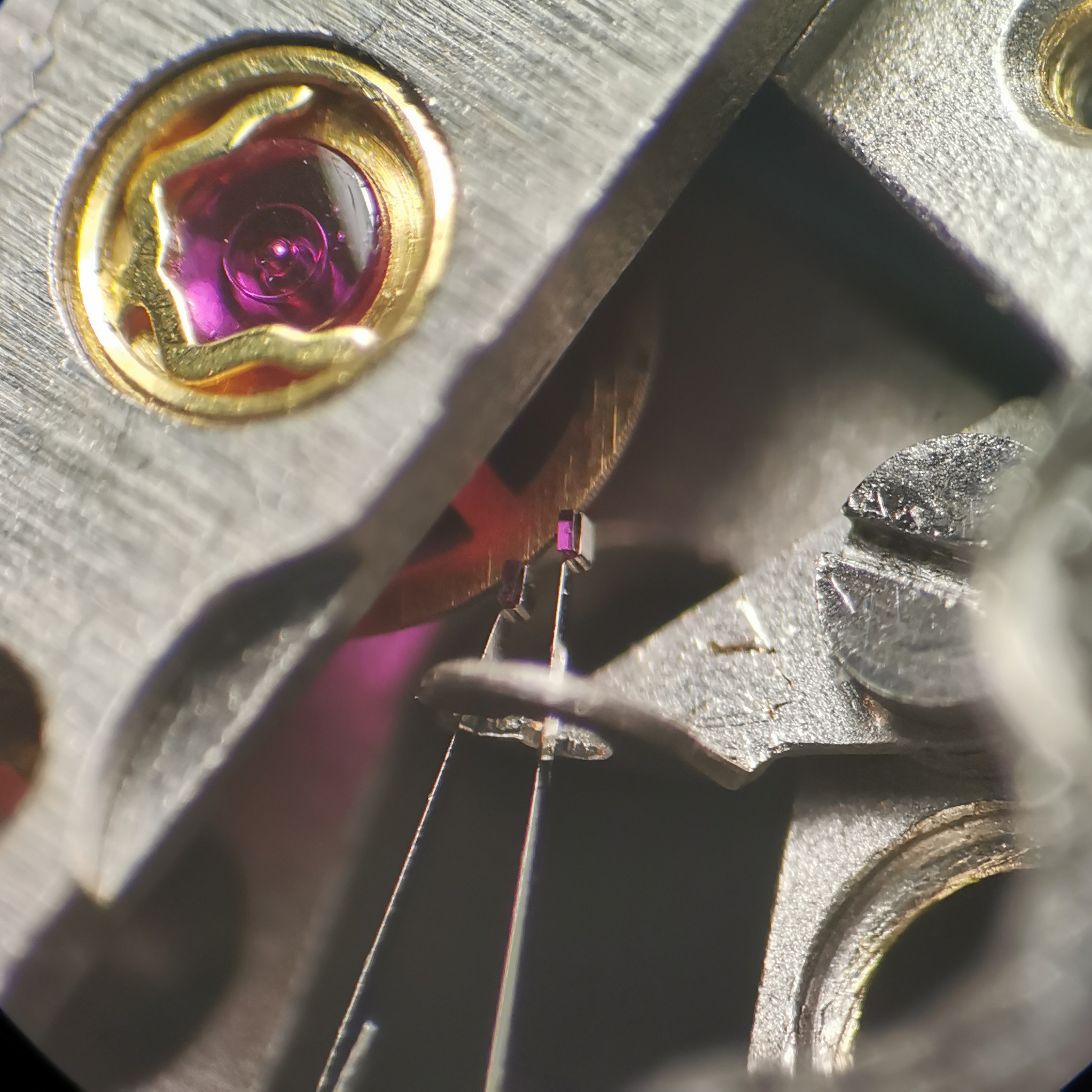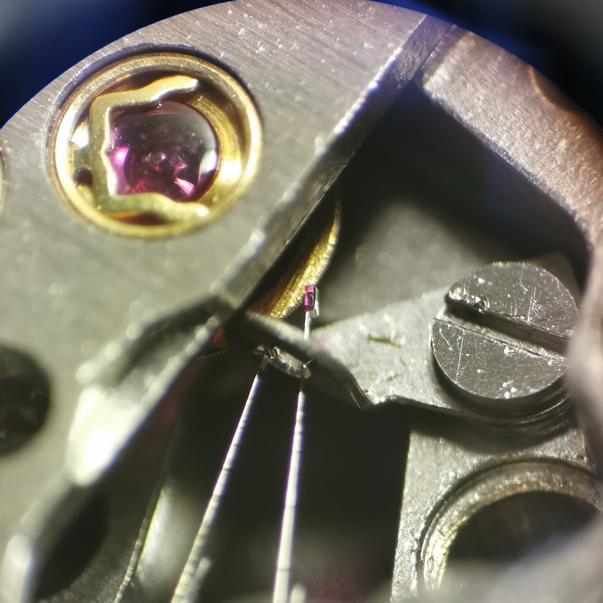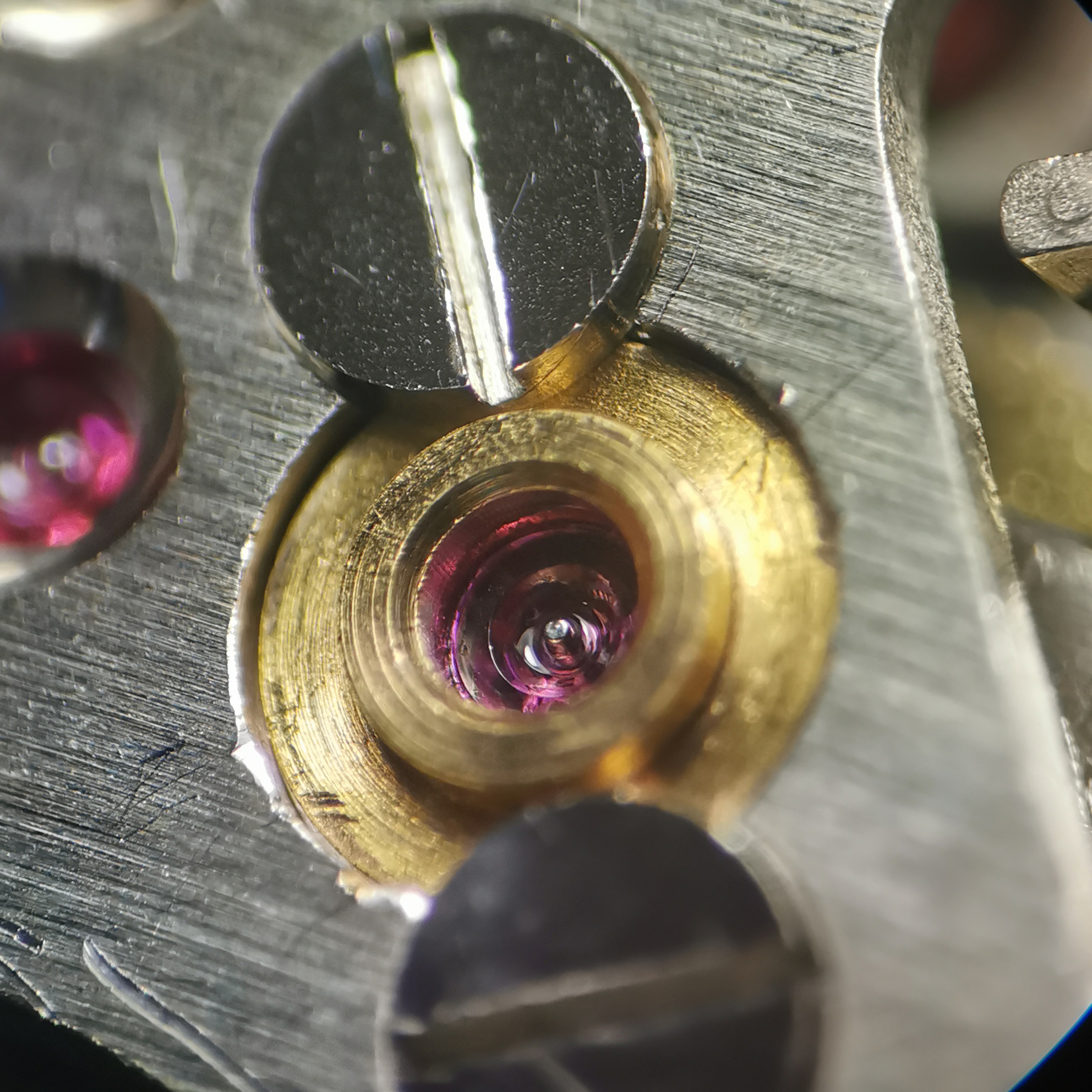 Anche sul movimento c’era da lavorare: oltre alla solita sporcizia e mancanza di lubrificante, qualcuno aveva montato il castone con rubino del pignone dei secondi sottosopra, causando lo sfregamento tra la sfera dei secondi e quella dei minuti: