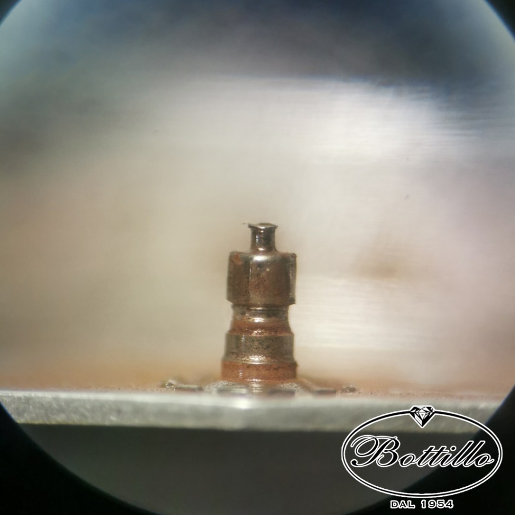 La prossima foto, scattata al microscopio a 40 ingrandimenti, mostra la forte usura del perno della massa oscillante di un movimento Rolex 2235. La foto successiva ritrae lo stesso componente da nuovo: ogni volta mi stupisce quanto la sporcizia e la mancanza di lubrificazione possano consumare ottone, acciaio e persino i rubini!