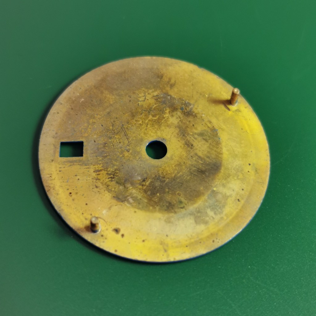 Foto fronte e retro del quadrante, ottimamente conservato e particolare nella sua ‘tridimensionalitร ’.
