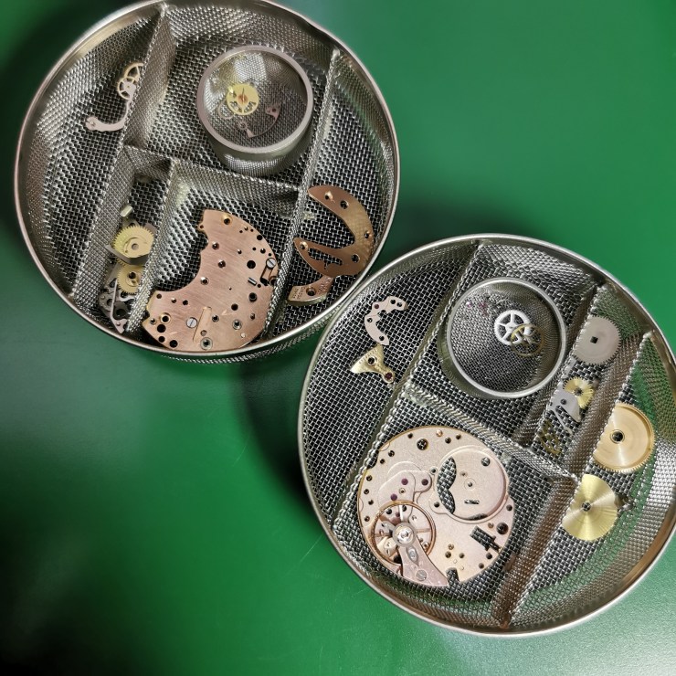 Il calibro viene completamente smontato e i vari pezzi disposti con criterio all’interno dei settori nei cestelli. Seguiranno lavaggio ed asciugatura automatizzati.