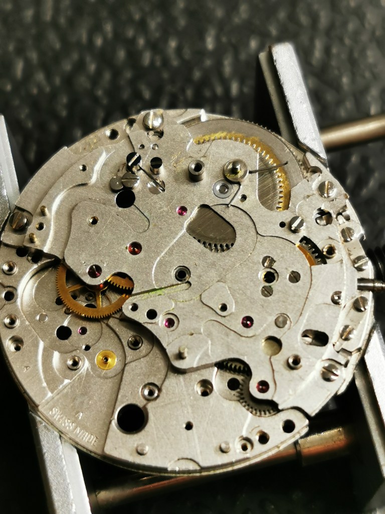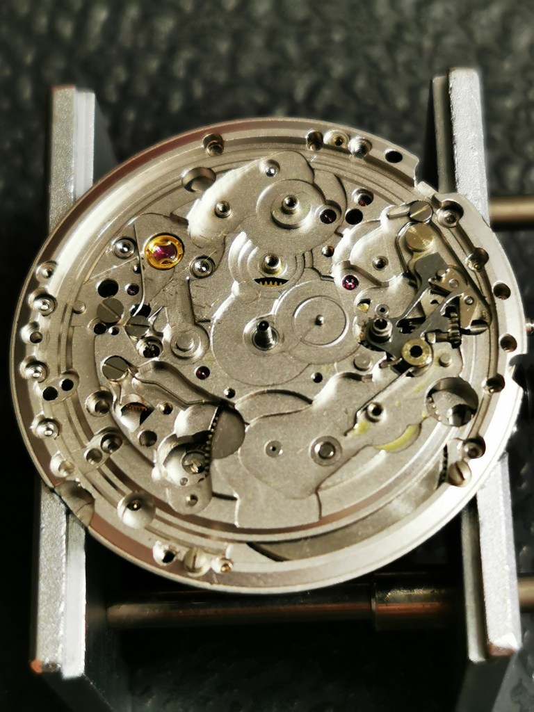 Si nota inoltre il trizio originale della sfera secondi cronografici quasi distaccato che metterรฒ in sicurezza e la mancanza di lubrificazione sulla contropietra del bilanciere, sintomo di manutenzione necessaria.