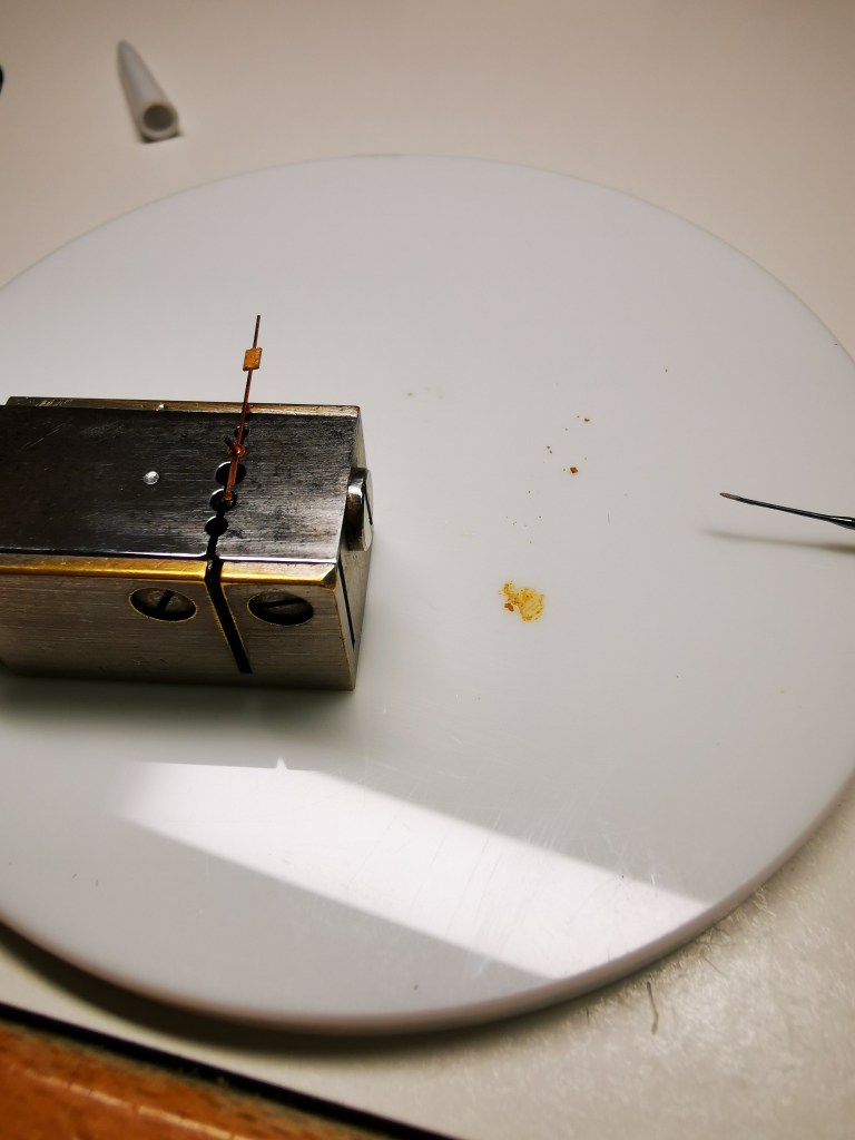 Vi mostro una foto della messa in sicurezza del trizio della sfera secondi cronografici: dopo aver mescolato una pasta di colore identico all’ originale, l’ho applicata sul retro del rettangolino in modo che sorregga anche il materiale originale sul lato frontale.