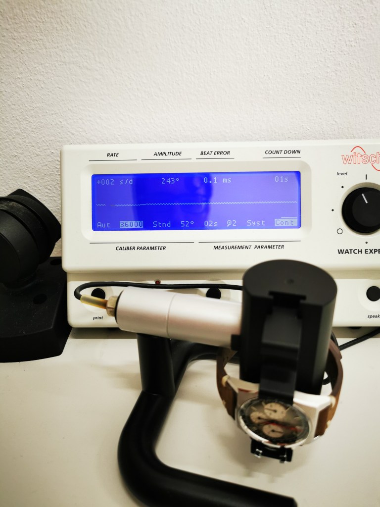 Una volta rimontato tutto e lubrificato secondo i manuali tecnici Zenith controllo il funzionamento al cronocomparatore in varie posizioni: