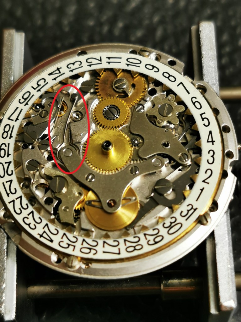 Qualche immagine dello smontaggio. Nella prima foto ho evidenziato la molla dello scatto del datario, che negli anni ha mostrato di rompersi spesso per fatica.