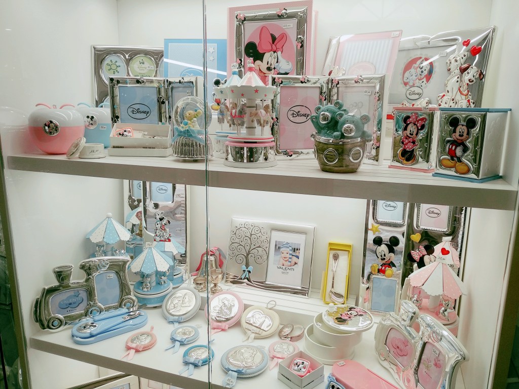 Articoli per bambini con rifiniture in argento: cornici, portaciuccio, luci da notte, sopraculla, giostre carillon e tanto altro ancora.