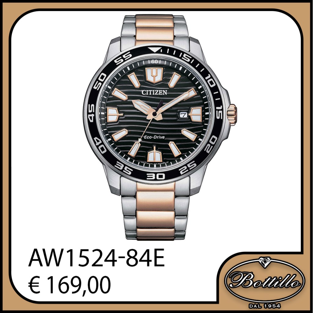 Citizen Eco-Drive in acciaio bicolore, impermeabile 10 ATM. Diametro cassa 45mm.