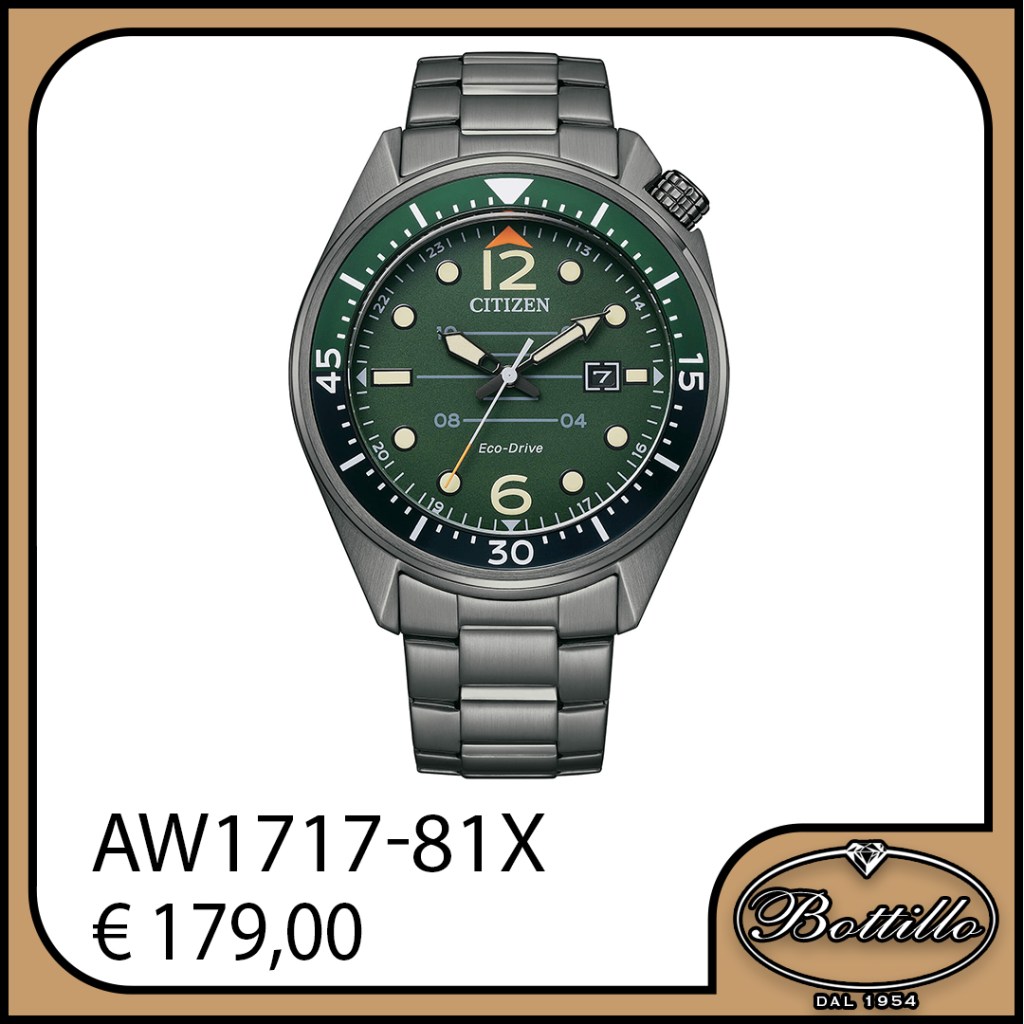 Citizen Eco-Drive in acciaio brunito con ghiera in alluminio, impermeabile 10 ATM. Diametro cassa 43mm.