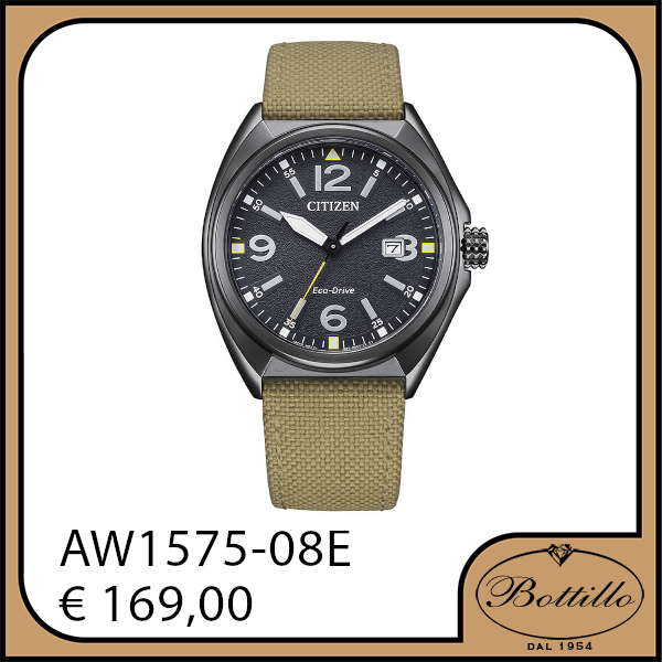 Citizen Eco-Drive in acciaio brunito, cinturino in cordura, impermeabile 10 ATM. Diametro cassa 41mm.