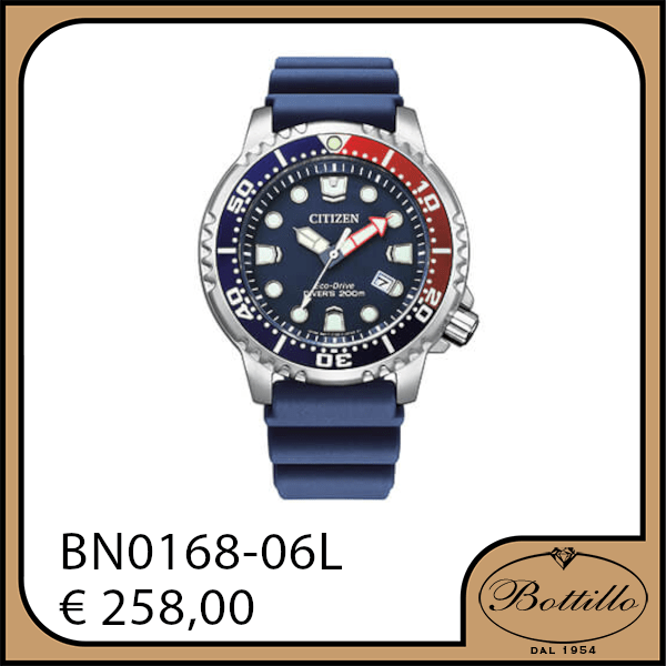 Citizen Eco-Drive Promaster, Diver’s professionale certificato, cassa in acciaio e cinturino in gomma con ghiera girevole unidirezionale e indici e sfere ad alta luminosità, impermeabile 20 ATM. Diametro cassa 44mm.