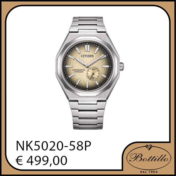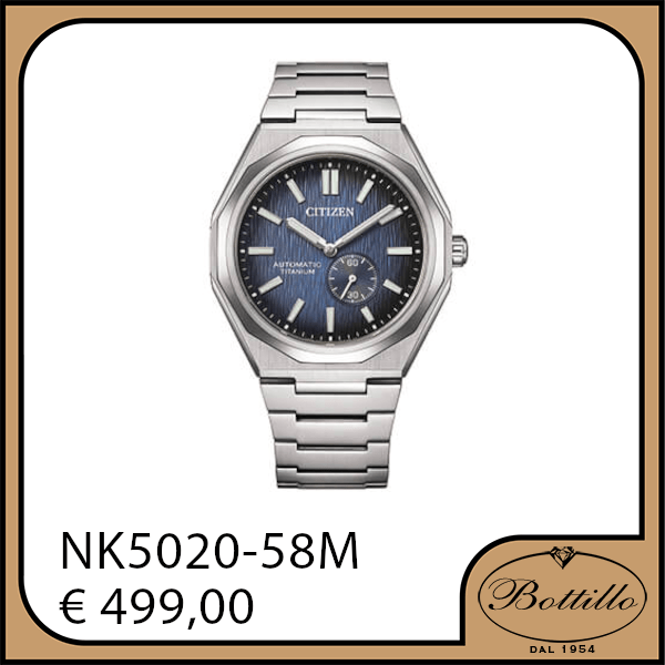 Citizen “Zenshin 60” Automatico con riserva di carica 60 ore e piccoli secondi a ore 4. Quadrante finemente lavorato, cassa e bracciale in Super-Titanio (Titanio grado 2 con lavorazione Duratect), vetro zaffiro con trattamento antiriflesso e oblò su fondello con movimento a vista. Impermeabile 10 ATM. Diametro cassa 40mm.