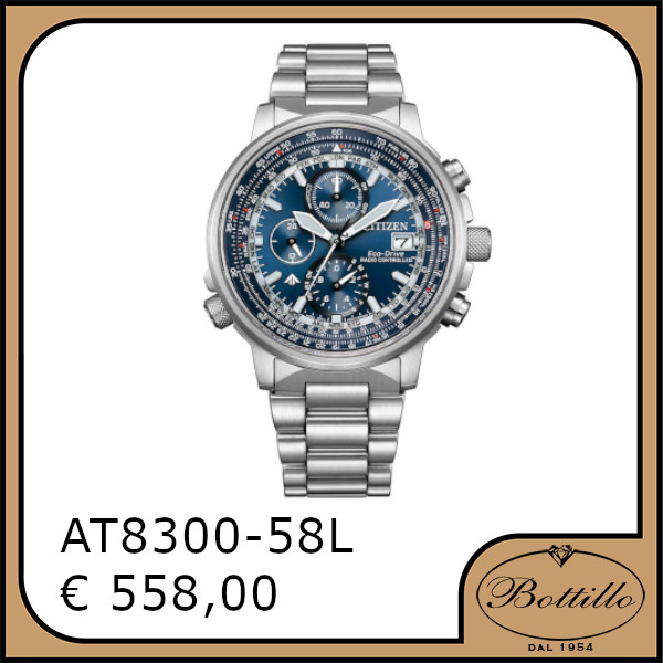 Citizen “Crono Pilot” Eco-Drive cronografo, radiocontrollato 5 canali, cassa e bracciale in acciaio con vetro zaffiro, regolo calcolatore di tipo aereonautico, impermeabile 20 ATM. Diametro cassa 41 mm.