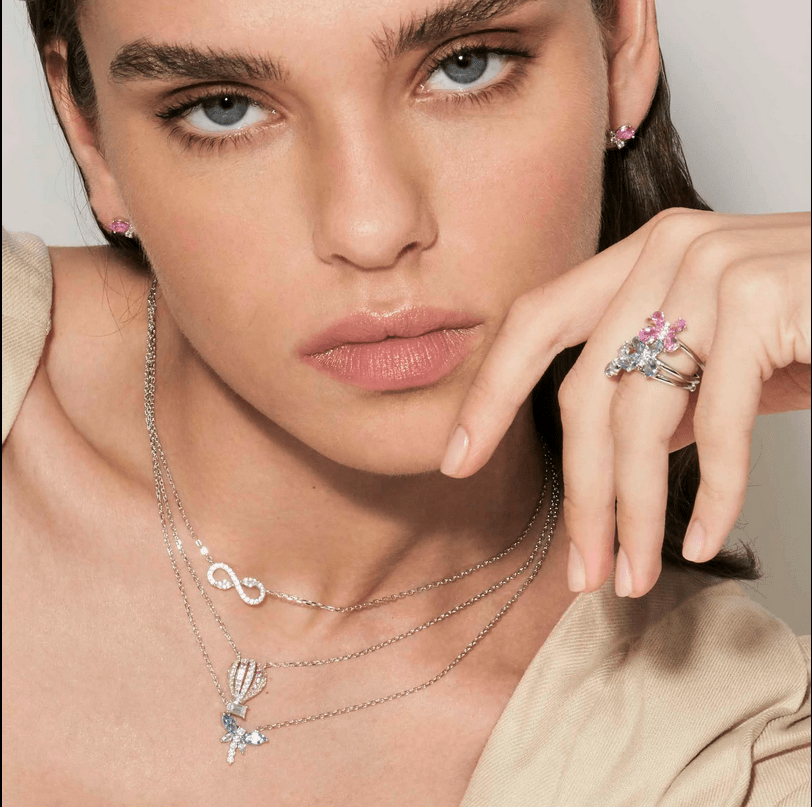 Gioielli in argento 925 rodiato con zirconia cubica bianchi e colorati, uniti per formare farfalle, cuori, mongolfiere e infiniti.
