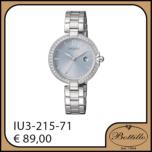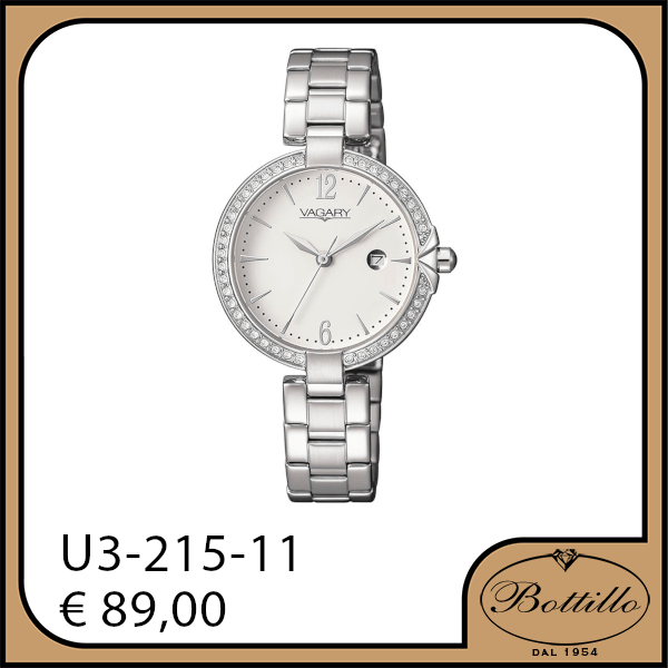 Orologio da donna Vagary in acciaio con ghiera di cristalli, impermeabile 5 ATM. Diametro cassa 30mm.